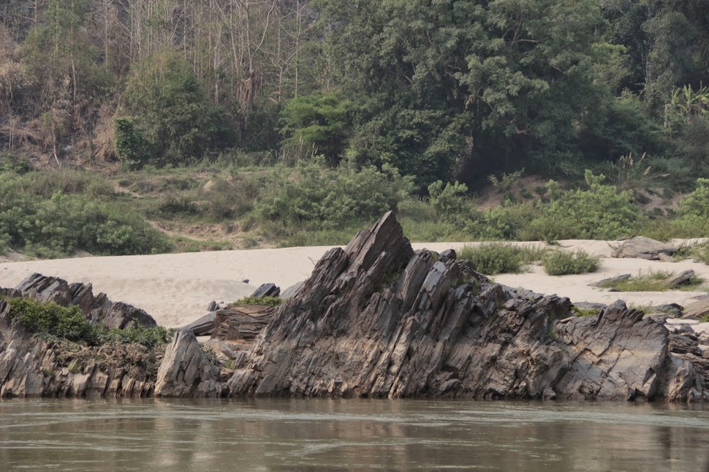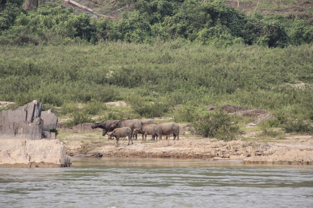 Kart cliffs and green hills alternate and some time some burn areas, the locals did to prepare the field for the next harvest. The river is also changing, the dry season leave the big rock appear outside of the water, so sailing is not that easier but the view is more charming for us.