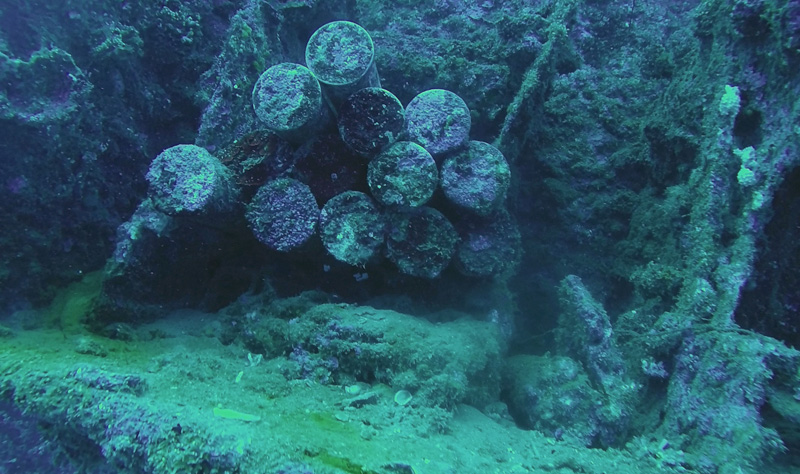 Les deux plongées de jours que nous avons faites nous on permis en premier lieu de découvrir le Coolidge de l’extérieur, comme un tour de reconnaissance. C’est assez déroutant de voir ce navire, avec des trous dans les parois qui nous laisse entrevoir l’intérieur, comme la salle de bain des marins par exemple.
