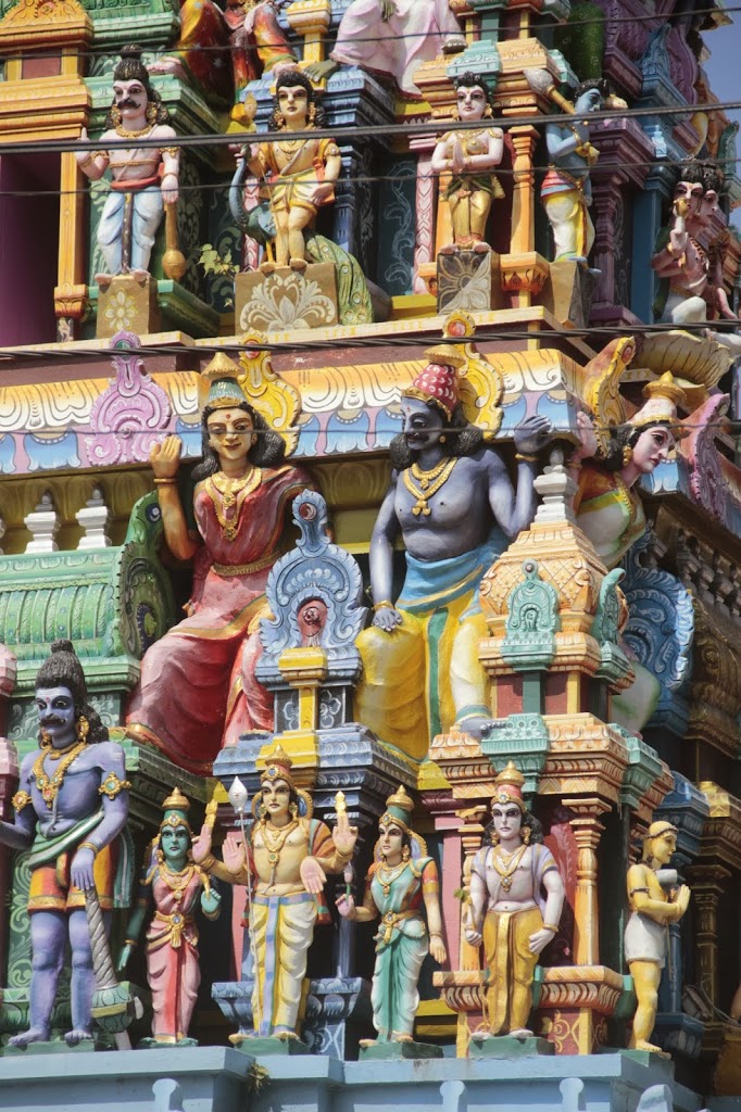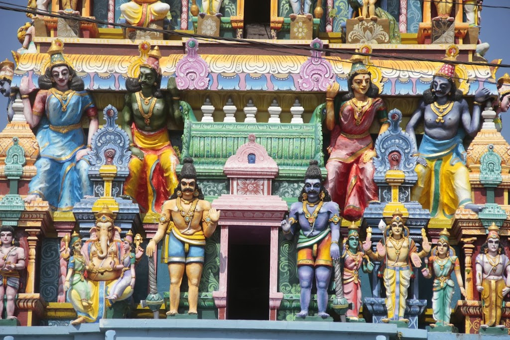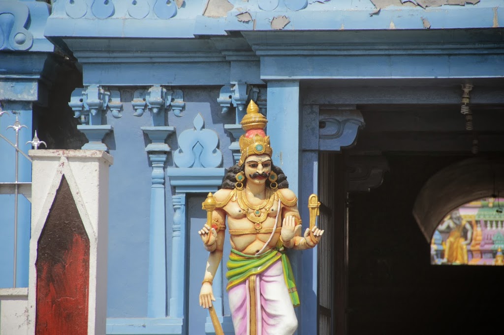 Details of the crossed temple on the side of the road, extremely colorful where the statues bear mustaches.