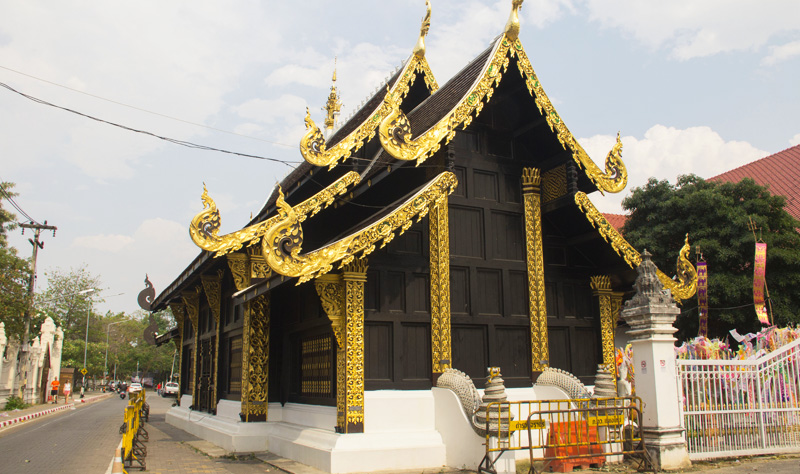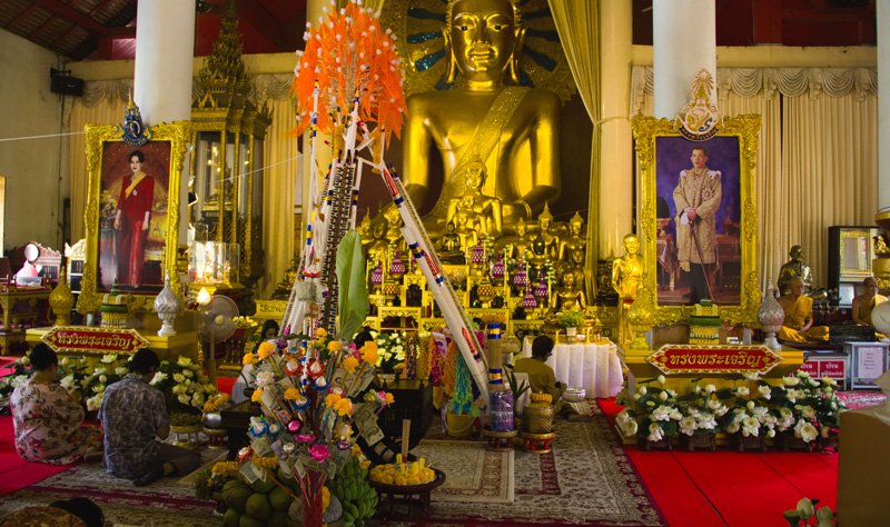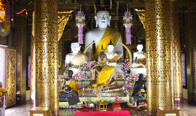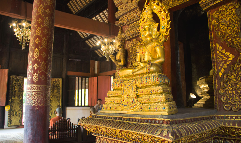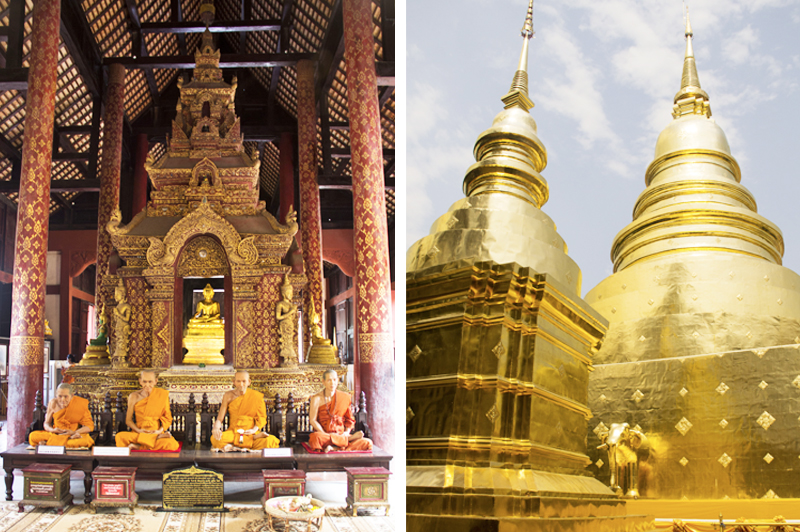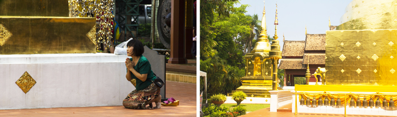 Nous qui pensions connaître la ville, nous avons continué à la découvrir. Les balades et batailles d’eau nous conduisaient d’un temple à un autre, et sur le chemin nous en avons découvert de nouveaux. Le Wat Phra Singh Woramahawihan par exemple aura été une belle découverte et j’ai un peu honte d’être passé à côté la première fois. C’est en suivant la parade de la Songkran que nous l’avons découvert. Le temple en lui-même ressemble un peu aux autres à l’intérieur, mais la perle de la découverte se trouve à l’arrière du temple. Un espace tout en doré où la lumière du soleil joue avec les reflets. Un havre de paix en ville.